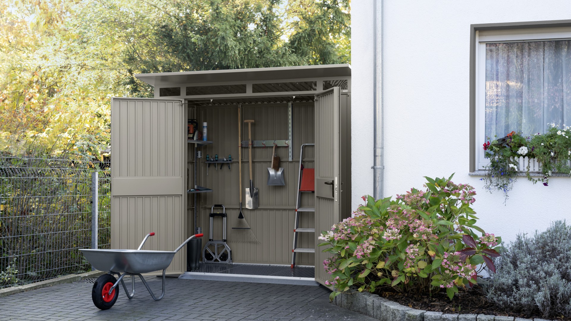 Déjà bien connu pour ses portes de garage, ses portes d'entrée, ses huisseries et ses portails, Hörmann propose également des solutions de rangement innovantes telles que des abris à outils et des supports à bois.