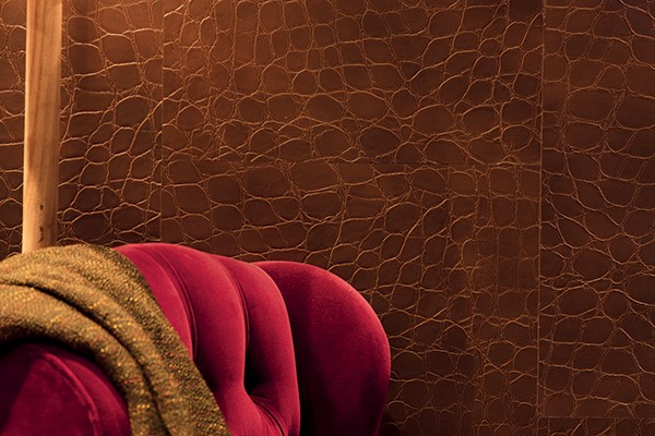 Les grandes dalles rectangulaires associent ainsi une sous-couche de liège de 2 mm revêtue d’une couche de 2 mm de cuir recyclé provenant de chutes du travail du cuir. Le revêtement est disponible en quatre motifs (serpent, autruche, crocodile et cuir fin) et en neuf coloris, allant de l’ocre au brun foncé et du bordeaux au noir.