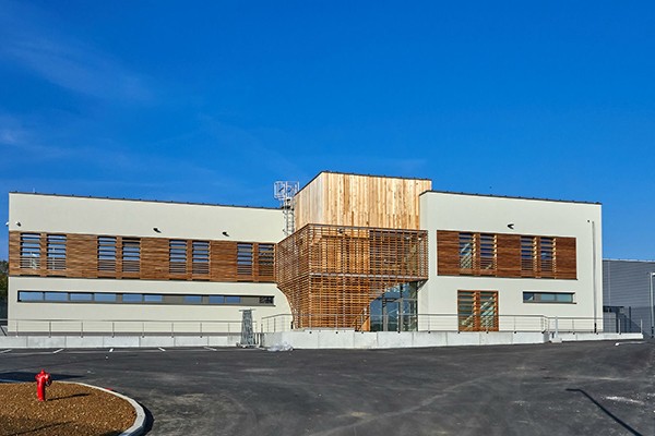 Les deux volumes présentent des toitures plates pourvues respectivement de panneaux photovoltaïques et d’une toiture végétale extensive.