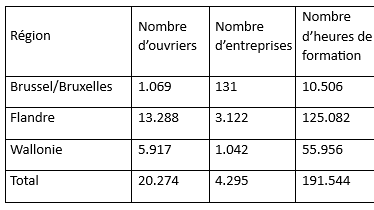 Les chiffres les plus récents (fin février 2024) en ce qui concerne le nombre d’ouvriers, le nombre d’entreprises et le nombre d’heures dispensées dans le cadre des formations en sécurité de base qui entrent en ligne de compte pour être conformes à la réglementation sur la formation de base en sécurité. Il s’agit de toutes les formations dispensées depuis l’entrée en vigueur de la CTT sur la formation de base obligatoire (12 mai 2022).